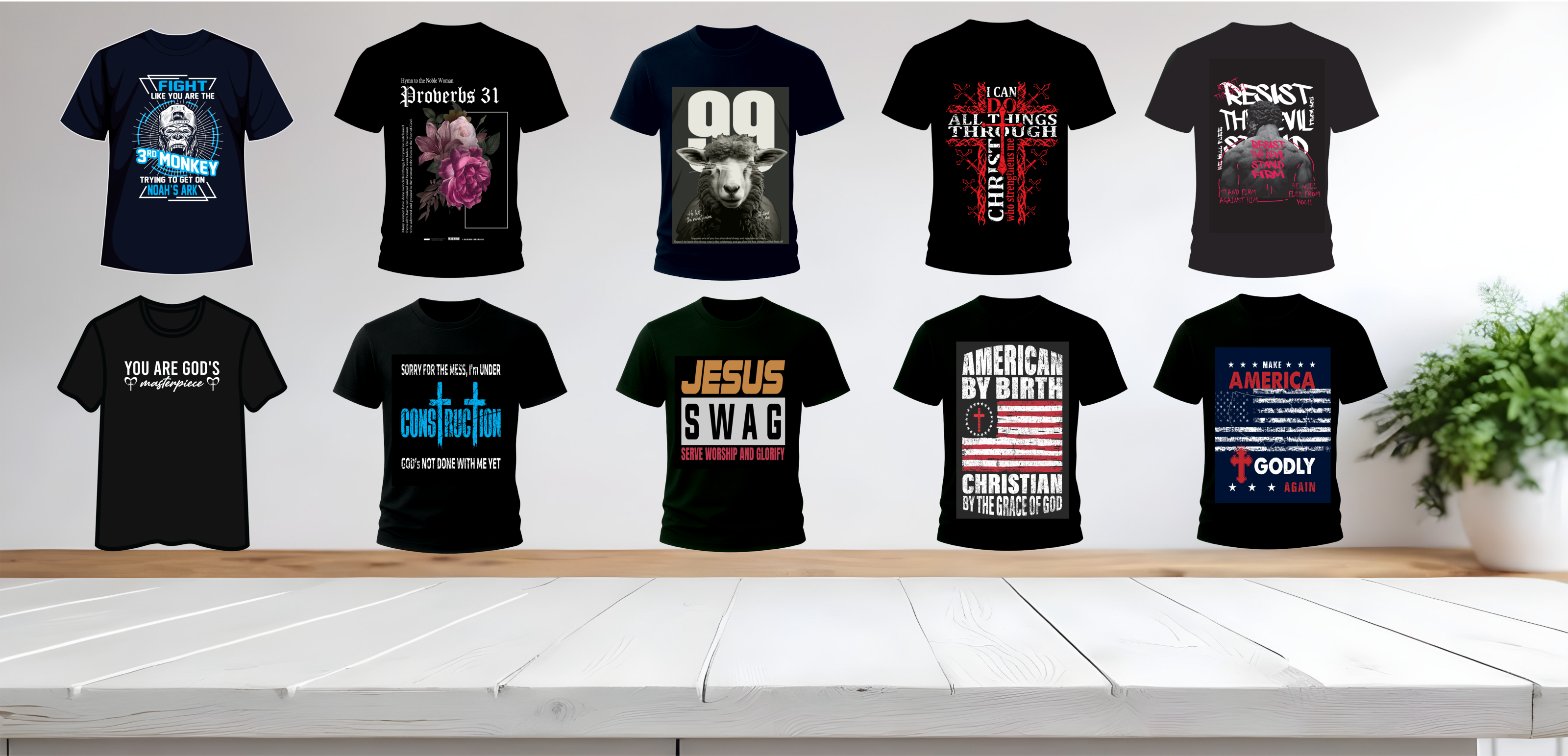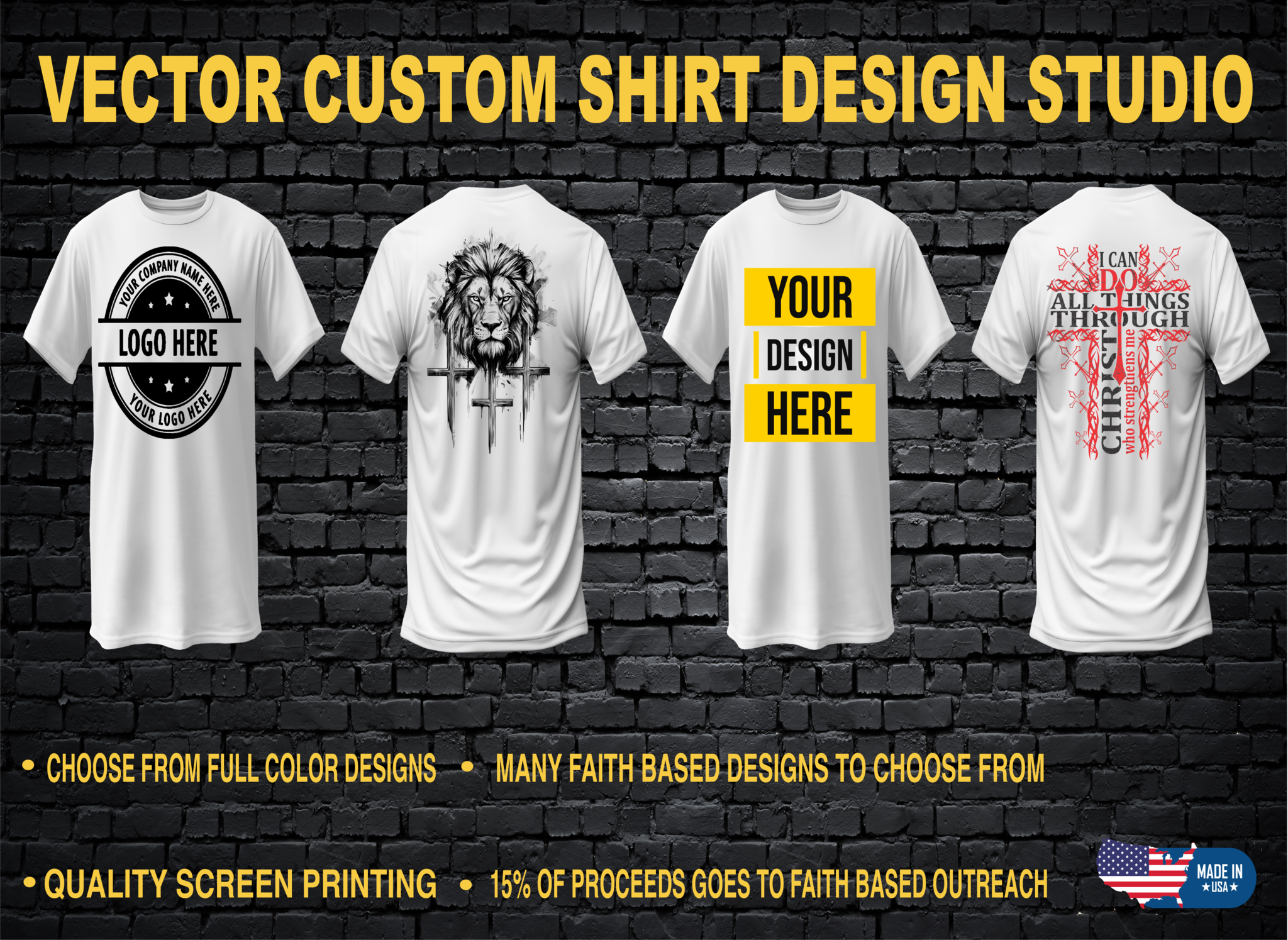 We are a printing company that is focused on quality prints and embroidery's that are geared towards Churches and Christian apparel. We will also print all t-shirts and Hats but we Pride ourselves in having more options for the Faith Based side. We use Quality Products and We believe in Quality Prints that will last. We sell our designs and also allow you to mix and match the designs to add your personal touch with your logo or your own designs. We Hope you enjoy the design studio and please feel free to add any comments to help us do better.